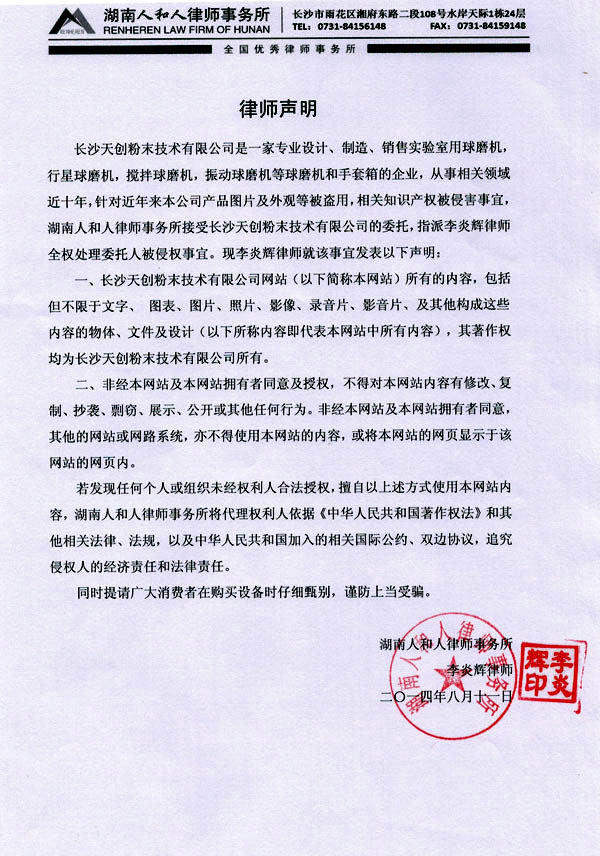 長(zhǎng)沙天創(chuàng)粉末技術(shù)有限公司強(qiáng)烈譴責(zé)這種欺騙消費(fèi)者的違法行為,并正在積極采取維權(quán)措施,追究侵權(quán)者的法律責(zé)任,制止這種侵權(quán)和欺騙消費(fèi)者的行為。望廣大消費(fèi)者認(rèn)準(zhǔn)正牌廠家,以免上當(dāng)受騙。