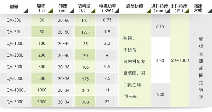 1. 型號說明:QM-(體積)-(A調速型,B普通型)   如:QM-50-A 為50L調速型輥筒球磨機;