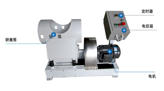 實(shí)驗(yàn)振動(dòng)磨機(jī)主要由機(jī)架、底架、激振器、磨筒、彈簧、電機(jī)等組成,機(jī)器啟動(dòng)時(shí),電機(jī)驅(qū)動(dòng)激振器,產(chǎn)生激振力,使磨筒作高頻小振幅的連續(xù)振動(dòng)。由于磨介的自轉(zhuǎn)和相對(duì)運(yùn)動(dòng)對(duì)物料產(chǎn)生頻繁沖擊與磨剝作用,從而達(dá)到均勻粉碎物料的目的。