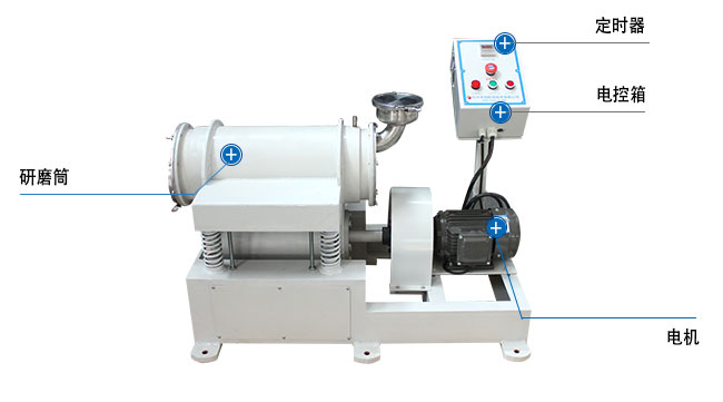 輕型振動(dòng)球磨機(jī)主要由機(jī)架、底架、激振器、磨筒、彈簧、電機(jī)等組成,機(jī)器啟動(dòng)時(shí),電機(jī)驅(qū)動(dòng)激振器,產(chǎn)生激振力,使磨筒作高頻小振幅的連續(xù)振動(dòng)。由于磨介的自轉(zhuǎn)和相對運(yùn)動(dòng)對物料產(chǎn)生頻繁沖擊與磨剝作用,從而達(dá)到均勻粉碎物料的目的。
